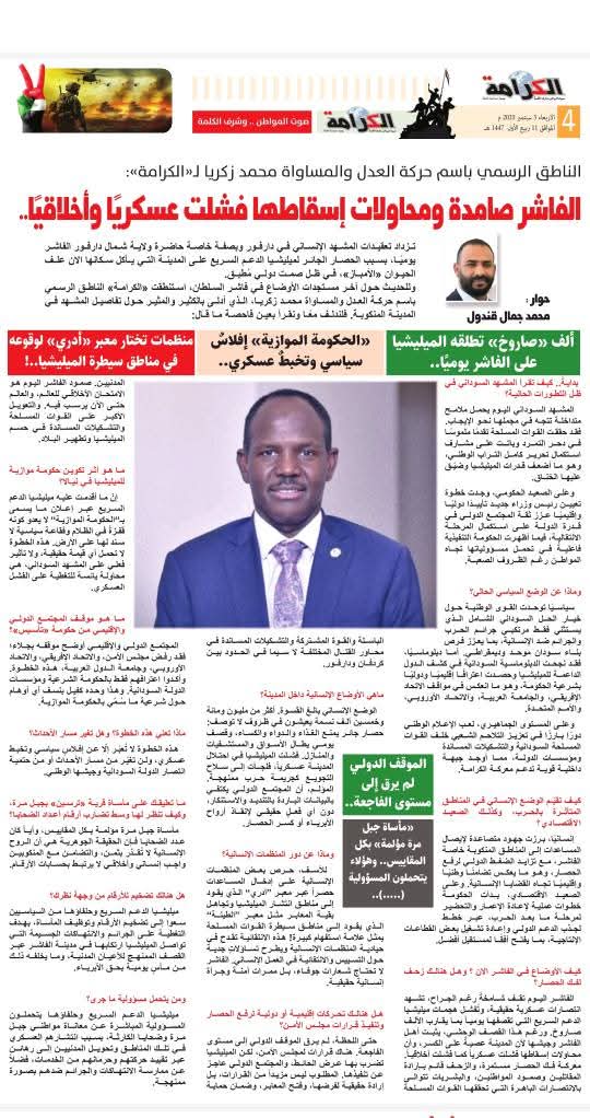 حوارالناطق الرسمي باسم حركة العدل والمساواة محمد زكريا لـ”الكرامة”: الفاشر صامدة ومحاولات إسقاطها فشلت عسكريًا وأخلاقيًا.. ألف “صاروخ” تطلقه الميليشيا على الفاشر يوميًا.. حوار:محمد جمال قندول