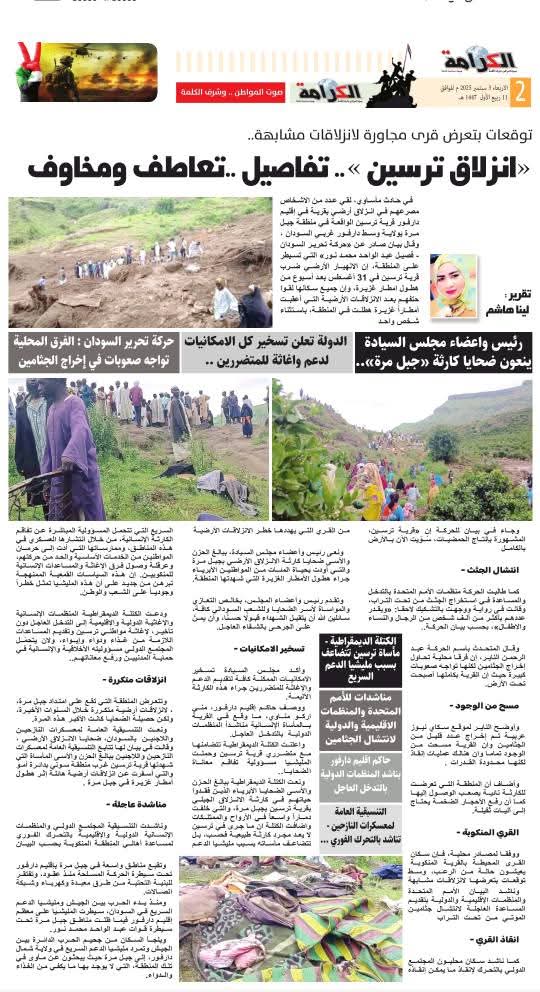 ونعت الكتلة الديمقراطية ببالغ الحزن والأسى الضحايا الأبرياء الذين فقدوا حياتهم في كارثة الانزلاق الجبلي بقرية ترسين بجبل مرة، والتي خلفت دماراً واسعاً في الأرواح والممتلكات واضافت الكتلة ان ما جرى في ترسين لا يعد مجرد كارثة طبيعية فحسب، بل تتضاعف مأساته بسبب مليشيا الدعم السريع التي تتحمل المسؤولية المباشرة عن تفاقم الكارثة الإنسانية، من خلال انتشارها العسكري في هذه المناطق، وممارساتها التي أدت إلى حرمان المواطنين من الخدمات الأساسية والحد من حركتهم، وعرقلة وصول فرق الإغاثة والمساعدات الإنسانية للمنكوبين. إن هذه السياسات القمعية الممنهجة تبرهن من جديد على أن هذه المليشيا تمثل خطراً وجودياً على الشعب والوطن.