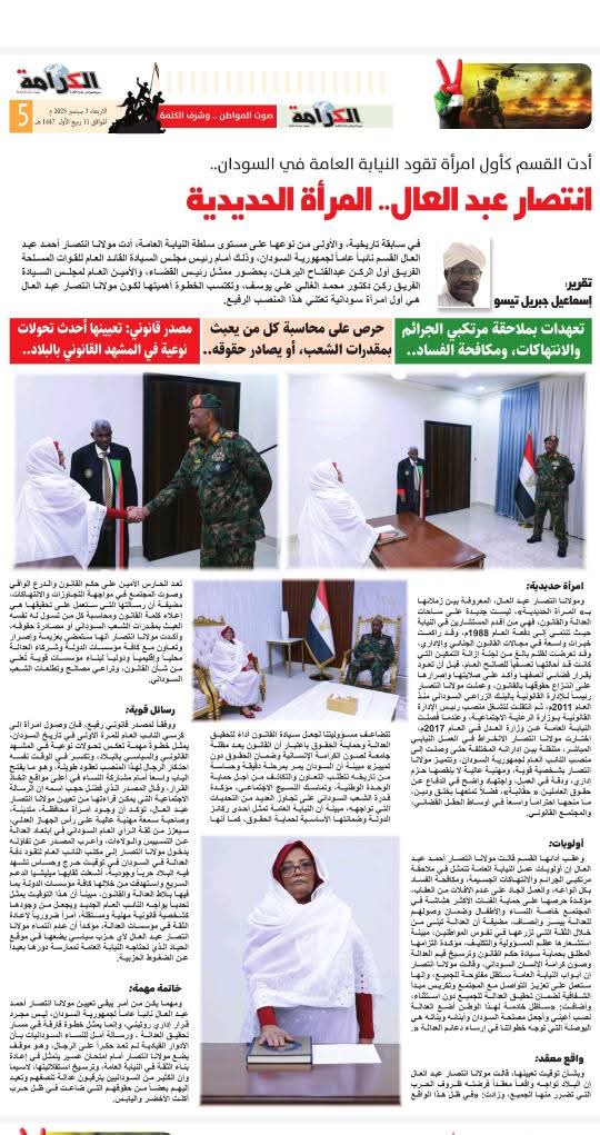 ومهما يكن من أمر يبقى تعيين مولانا انتصار أحمد عبد العال نائباً عاماً لجمهورية السودان، ليس مجرد قرار إداري روتيني، وإنما يمثل خطوة فارقة في مسار تحقيق العدالة ، ورسالة أمل للنساء السودانيات بأن الأدوار القيادية لم تعد حكراً على الرجال، وهو موقف يضع مولانا انتصار أمام امتحان عسير يتمثل في إعادة بناء الثقة في النيابة العامة، وترسيخ استقلاليتها، لاسيما وأن الكثير من السودانيين يترقبون عدالة تنصفهم وتعيد إليهم بعضاً من حقوقهم التي ضاعت في ظل حرب أكلت الأخضر واليابس.
